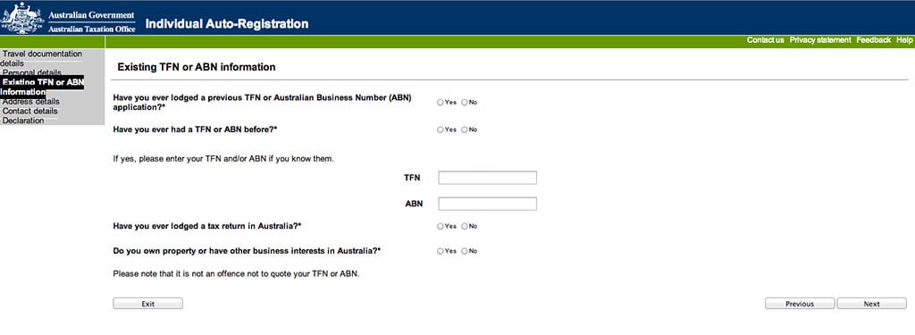 Si oui, il faut indiquer les numéros ABN ou TFN que vous détenez. On vous demande également si vous avez déjà bénéficié d’un Tax Return (un remboursement d’impôt) puis si vous avez un business en Australie en votre nom. En toute logique vous répondrez « No » à toutes les questions.